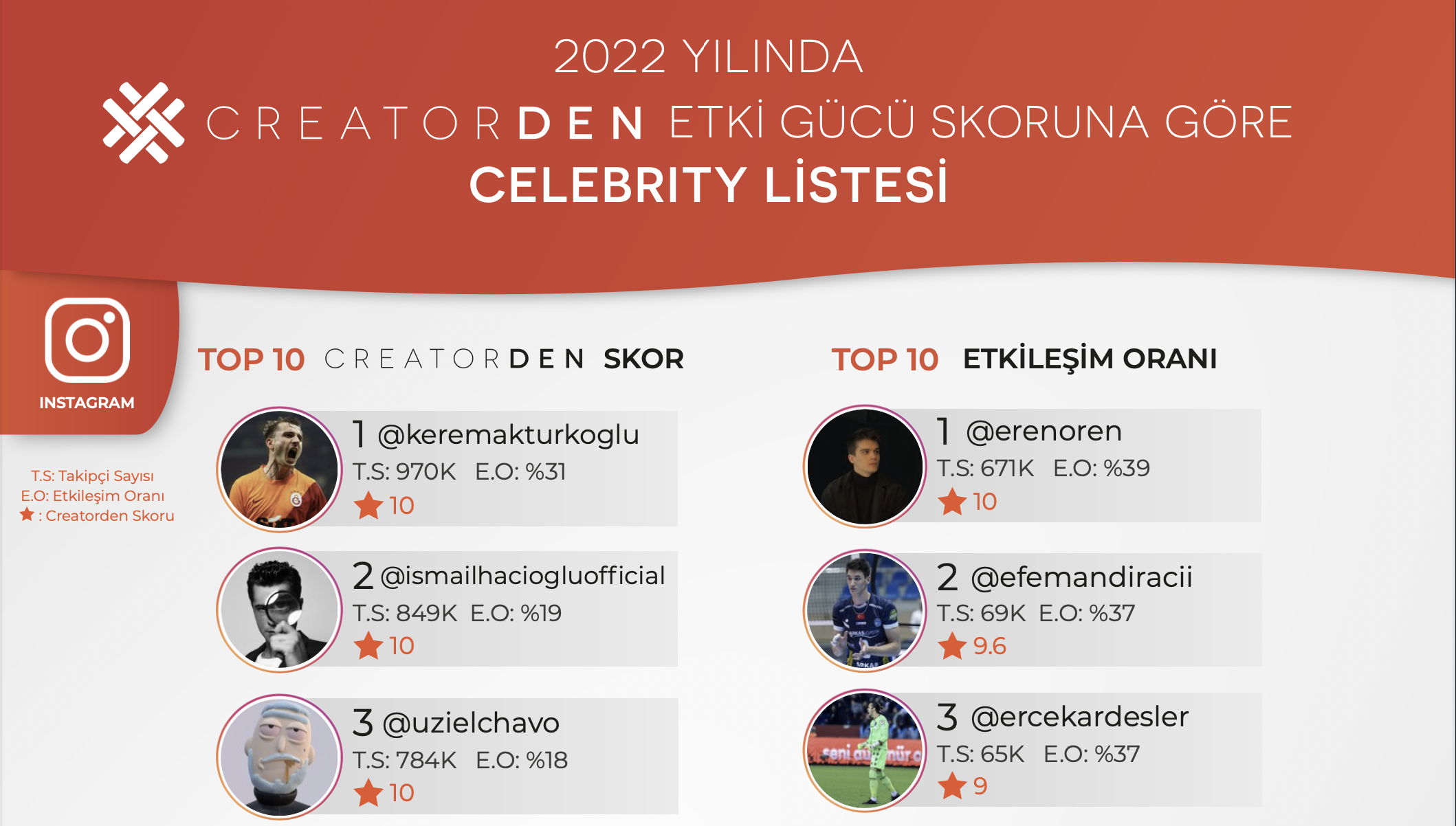 Aynı şekilde YouTube, Instagram ve TikTok’da en yüksek CreatorDen Etki Gücü Skoruna sahip influencerları sizlerle buluşturuyoruz. CreatorDen Etki Gücü Skoru birçok etkileşim ve performans metriğinin bir araya gelmesiyle oluşturulan, CreatorDen’in influencer seçimlerinde öncelikli olarak kullandığı metriktir. Listelerin tamamını görmek için raporumuzu indirebilirsiniz.